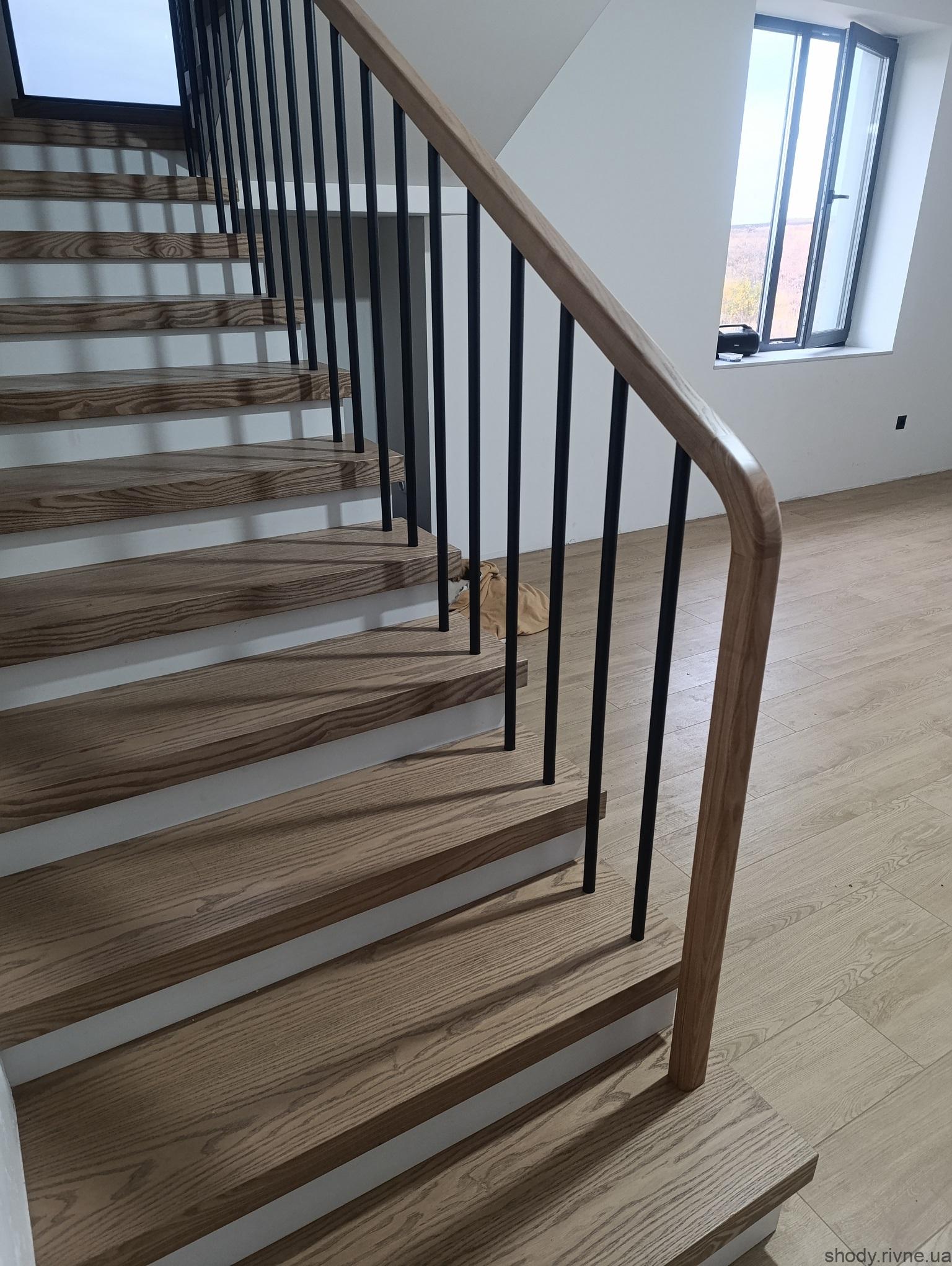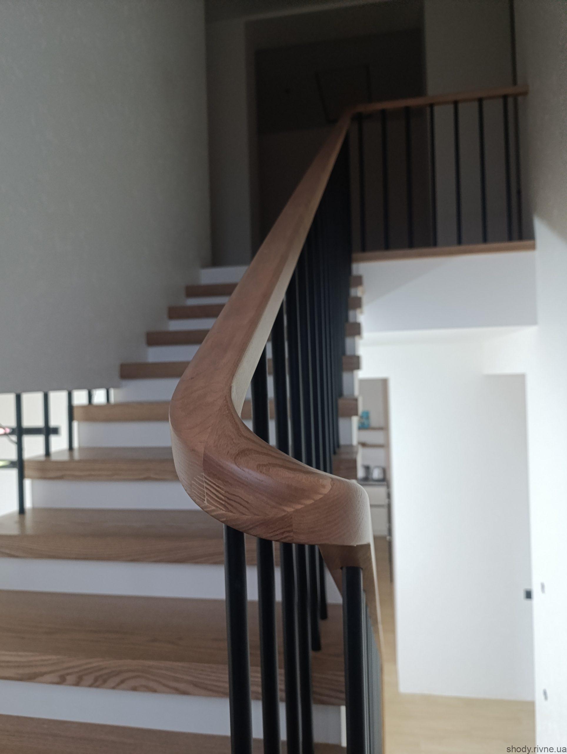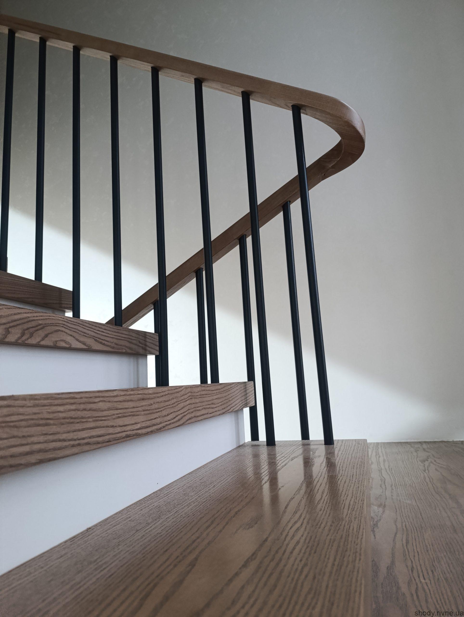 Дерев’яні сходи з ясена по бетону з гнутими перилами та металевими балясинами