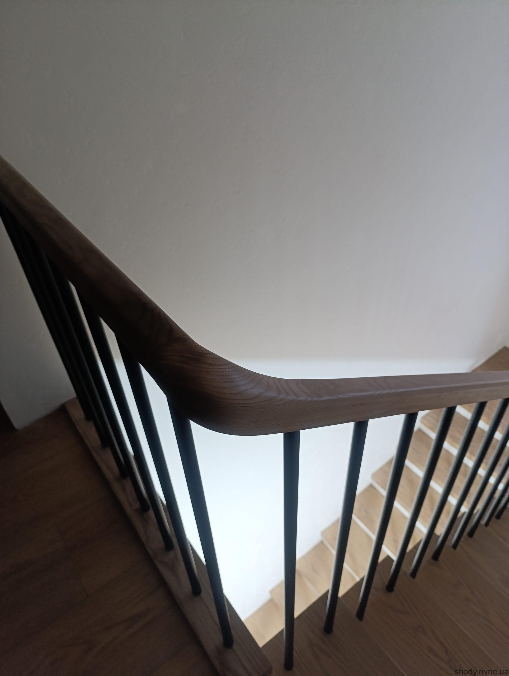 Гнуті перила з масиву ясена створюють плавні лінії та додають сходам вишуканості. Така форма не лише виглядає естетично, а й забезпечує комфортне та безпечне користування сходами. Ручна підгонка кожного елементу гарантує ідеальне прилягання до всієї конструкції.